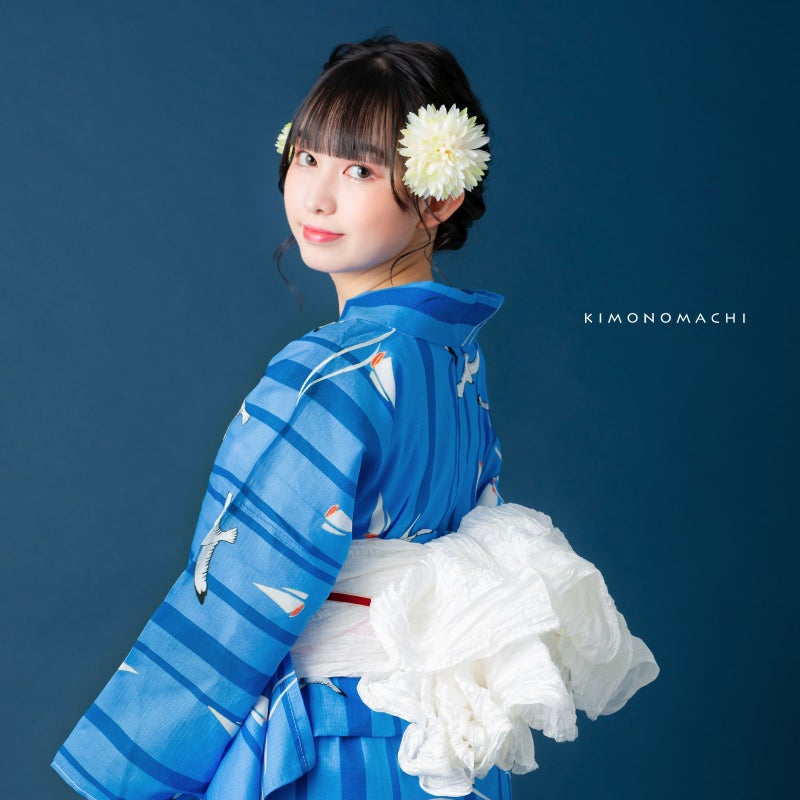 浴衣:シンプルで可愛らしい、マリン柄。濃い目の水色地に、太さの異なる青色の縦ライン。海や空のブルーを思わせる色合いの上のところどころに、黒いラインと白色で翼を広げて飛ぶカモメ、そして波の上に浮かぶ白いヨットのイラスト。