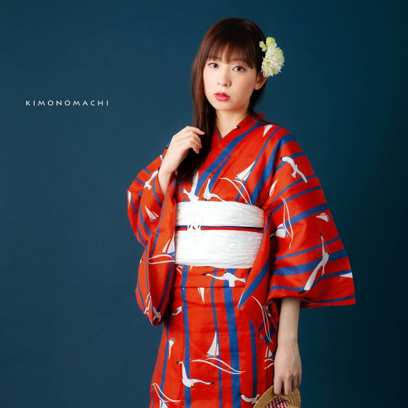 浴衣:ビビッドな印象がキュートなマリン柄。鮮やかな赤色に、太さの異なる明るい紺色の縦ライン。メリハリの効いた色合いの上のところどころに、黒いラインと白色で翼を広げて飛ぶカモメ、そして波の上に浮かぶ白いヨットのイラスト。
