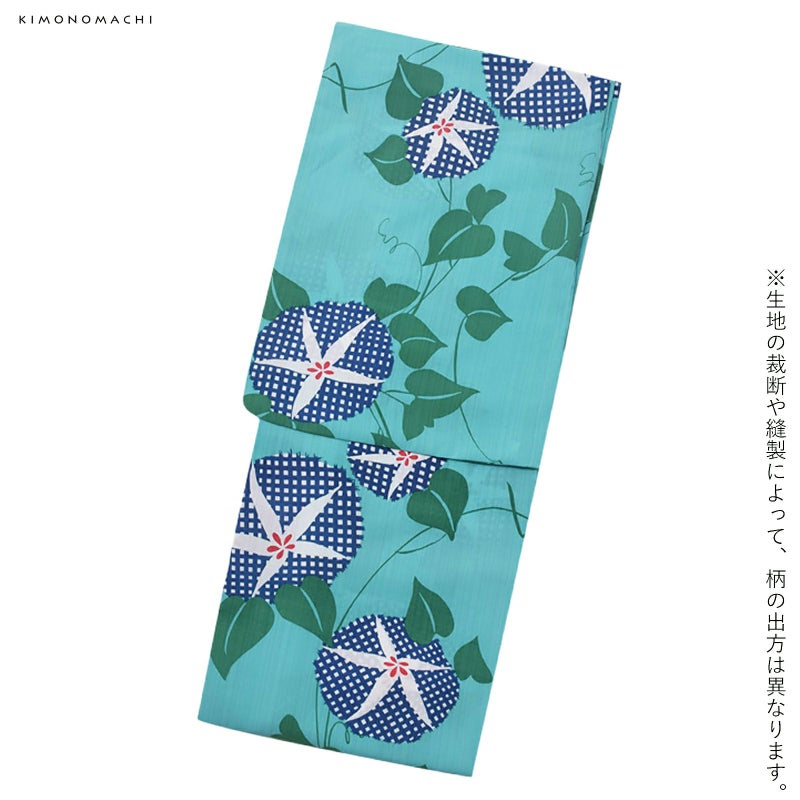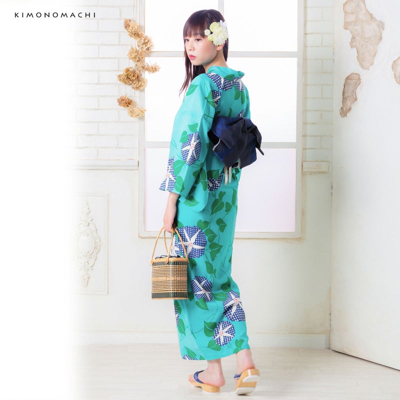 浴衣…ターコイズ系のグリーン地に、朝顔の花と葉と蔓模様がシンプルで可愛らしい。葉とツルは鮮やかな緑色で、朝顔の花部分は、濃い青色と白色のレトロな格子模様。花の中心部分の、濃い赤色がアクセントに。