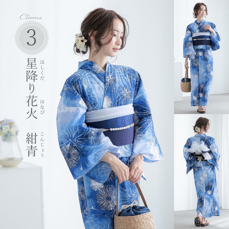 浴衣:淡い群青色に濃淡のあるネイビーの流れ。白やネイビー、水色の線で表現された花火。夏の夜に次々に打ちあがる花火のスターマインのような鮮烈な雰囲気の浴衣です。
