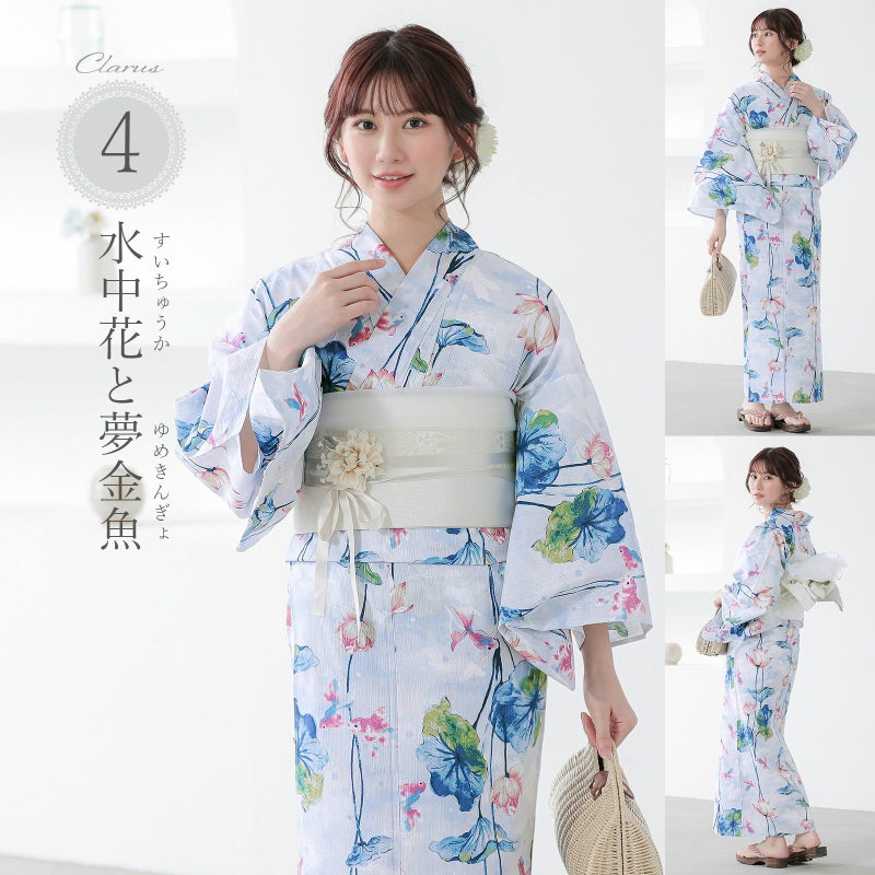 浴衣:白地にごく淡い紫みの青のぼかし。水彩調の蓮は、深い紺に藍色、黄緑の挿し色の入った葉、その間から長く伸びた茎の先にやわらかな赤紫に色づいた花、ベージュの影。夏の夢のような世界をふわふわと浮かび泳ぐ金魚たち。
