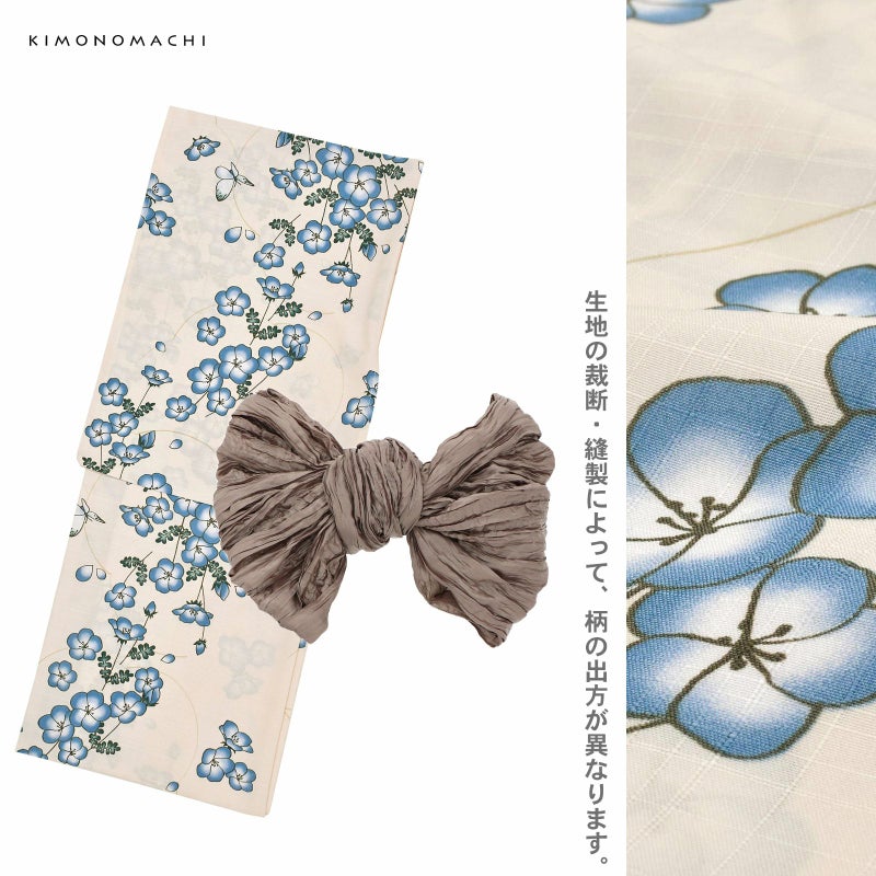 浴衣:淡いエクルベージュの地にチャコールの線で描かれたネモフィラの花々とモンシロチョウ。グレイッシュなブルーに白の花びら、ぼかしの入った青緑色の葉が爽やかな印象。蝶の羽に花と同系色の淡いブルーとグリーンの挿し色が入っています。背景の淡いカーキの線が描く花型が余白に変化をつけています。