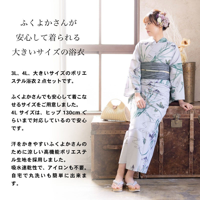3Lサイズ、4Lサイズの大きいサイズの浴衣です。体型によって適応サイズは前後しますが、3Lは17号、19号、21号、23号、4Lは21号、23号、26号の方向けです。