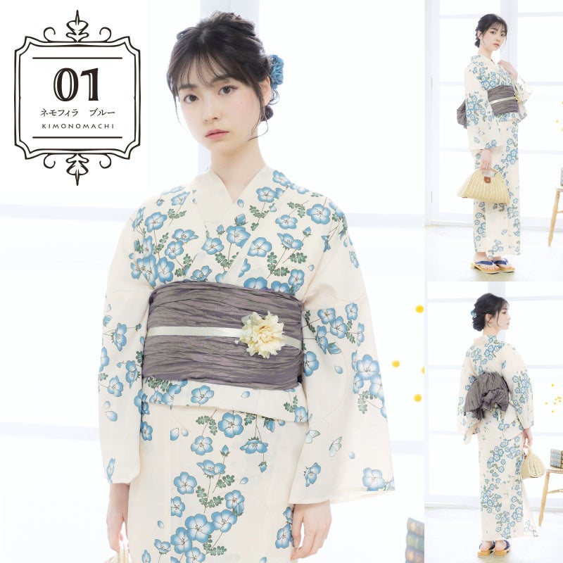 浴衣:淡いエクルベージュの地にチャコールの線で描かれたネモフィラの花々とモンシロチョウ。グレイッシュなブルーに白の花びら、ぼかしの入った青緑色の葉が爽やかな印象。蝶の羽に花と同系色の淡いブルーとグリーンの挿し色が入っています。背景の淡いカーキの線が描く花型が余白に変化をつけています。