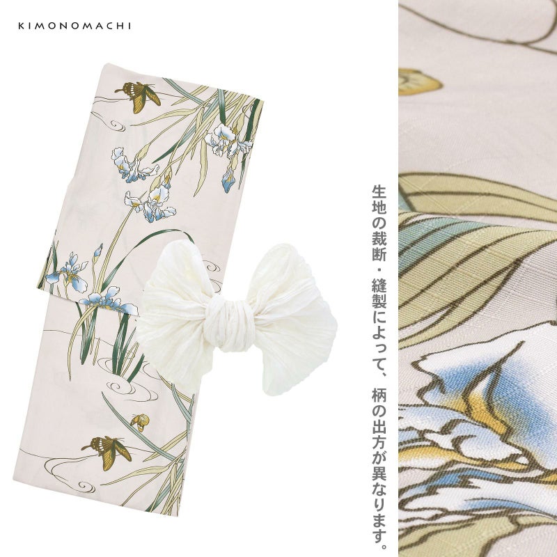 浴衣:浅い象牙色の地にチャコールの線で描かれたカキツバタとアゲハ蝶、シジミチョウ。グレイッシュなブルーに白、淡い橙色が入った花びら、浅い黄緑に深い青緑と青磁色の葉の細やかな色遣いが目を引きます。蝶は黄土色や白に深緑の挿し色。背景の流水紋が優しく上品な印象です。