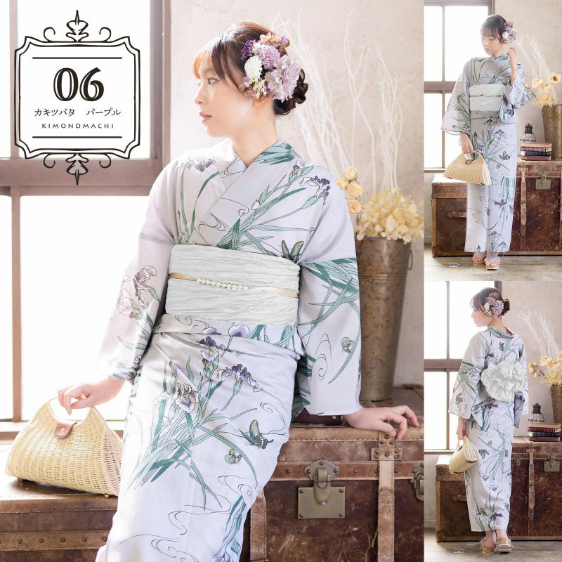 浴衣:淡いパープルグレーの地にインクブラックの線で描かれたカキツバタとアゲハ蝶、シジミチョウ。ややグレイッシュな深紫に白、淡い灰黄緑色が入った花びら、青緑と青磁色の葉がすっきりと大人っぽい印象です。蝶は灰黄緑色や青磁色に白の翅。背景の流水紋が優美な雰囲気を添えます。