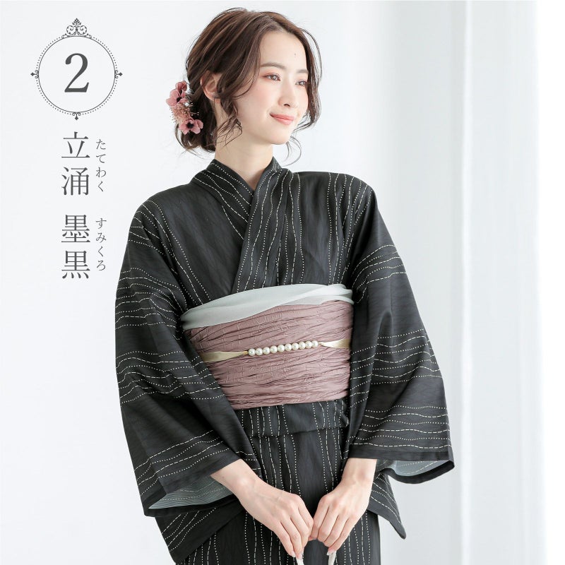 浴衣:墨黒の地に黒紫の重ね立涌。その上にアイボリーのドットや点線で表現された立涌がランダムに配置されています。