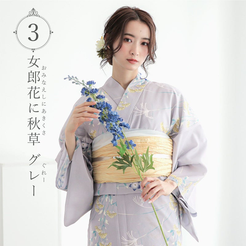 浴衣:明るいグレーの地に女郎花(おみなえし)などの秋草文様。青磁色にごく淡い黄緑の葉。からし色、黄土色に白などの細かな女郎花の花、青紫ぼかしの桔梗、わずかにグレーのススキの穂など、輪郭線がなくぼかした色彩の表現が優しい印象です。