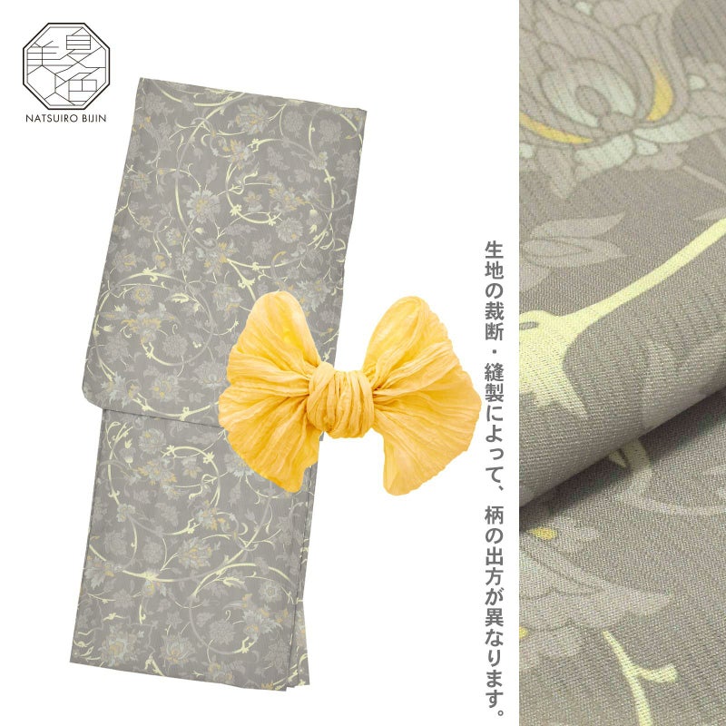 浴衣:黄みを帯びたグレーの地。グレージュを基調に、薄グレーや浅い黄色の配色の宝相華の文様。円を描く唐草の蔓に明るいクリームイエローの挿し色が連続模様に変化をもたらしています。