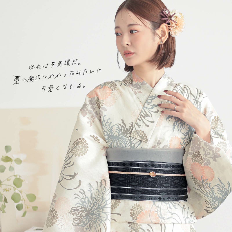 浴衣:アイボリーの地に、グレーと抹茶色のぼかしの入った大きな糸菊の花。コーラルピンクや抹茶色、淡い桃色の菊の花紋にウォームグレーの葉。糸菊の繊細な華やかさと優しい配色が落ち着いたかわいらしい雰囲気です。