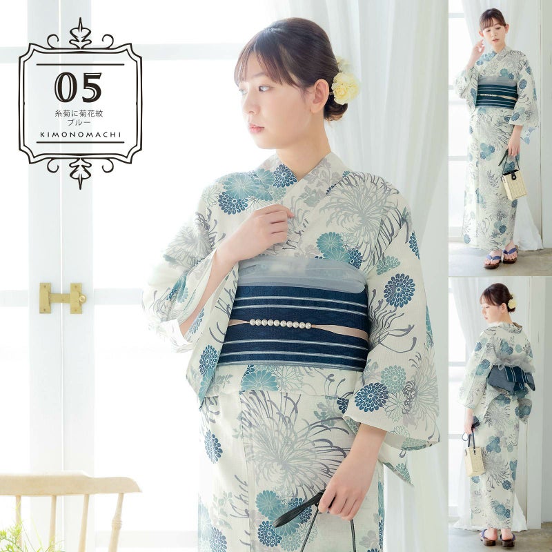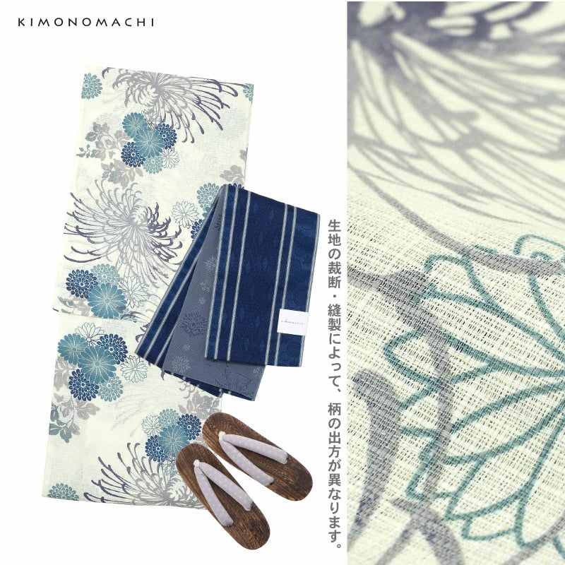 浴衣:アイボリーの地に、グレーと青紫のぼかしの入った大きな糸菊の花。紺や浅葱色、ブルーグレーの菊の花紋にグレーの葉。糸菊の繊細な華やかさとシックな配色が大人っぽい雰囲気です。