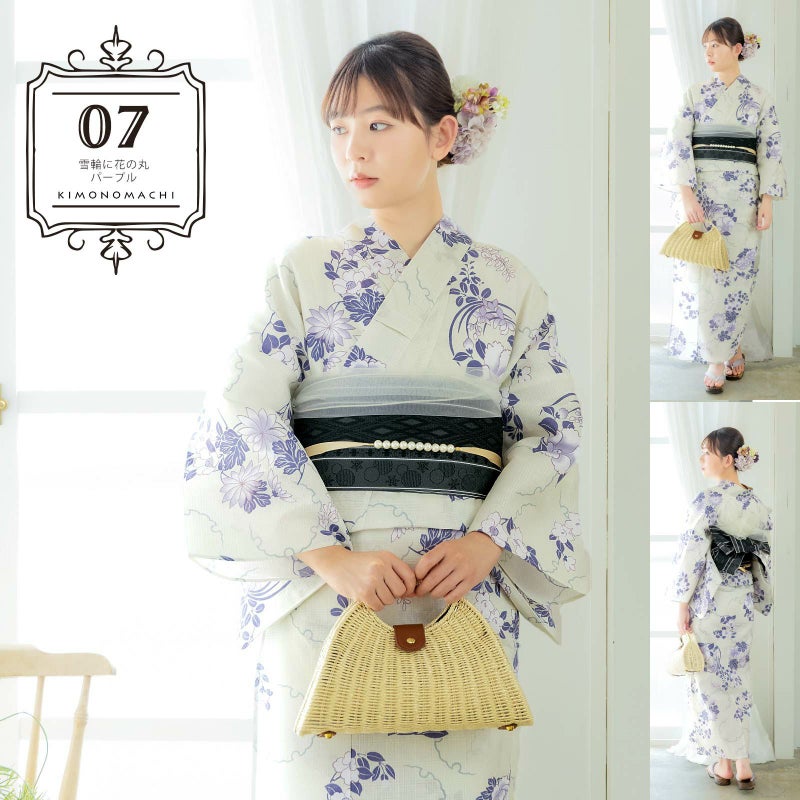 浴衣:アイボリーの地に青灰色の雪輪。白に淡い青みのパープル、青みの濃鼠色で表現された椿や蘭、萩に桔梗、牡丹、桜などの四季の花の丸文様。古典的な文様と現代的な色彩の組み合わせが魅力です。