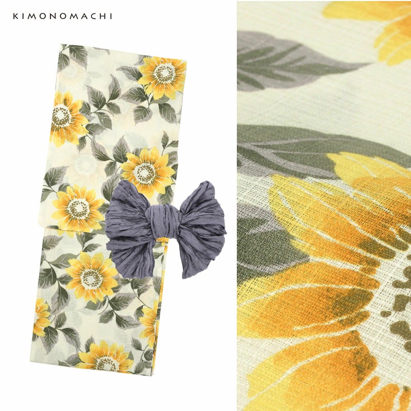 浴衣:アイボリーの地に浅い抹茶色、黄色、淡い黄色で表現されたヒマワリの花。夏の太陽のような明るい黄色と、輪郭のない水彩調のぼかした表現がさわやかなデザインです。