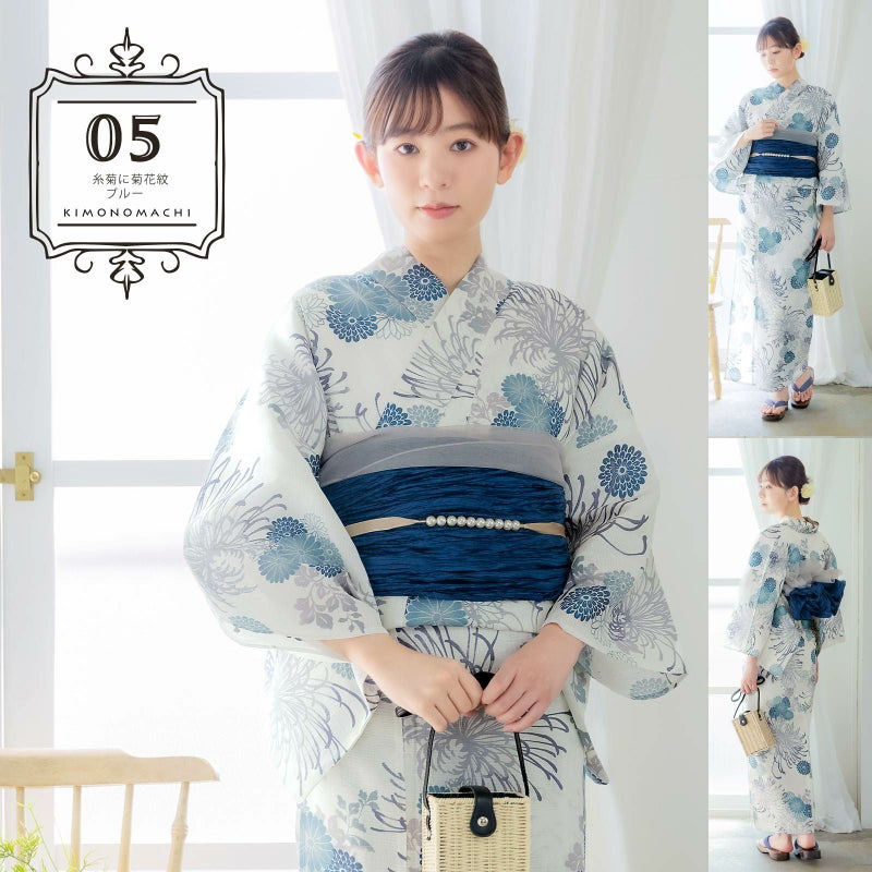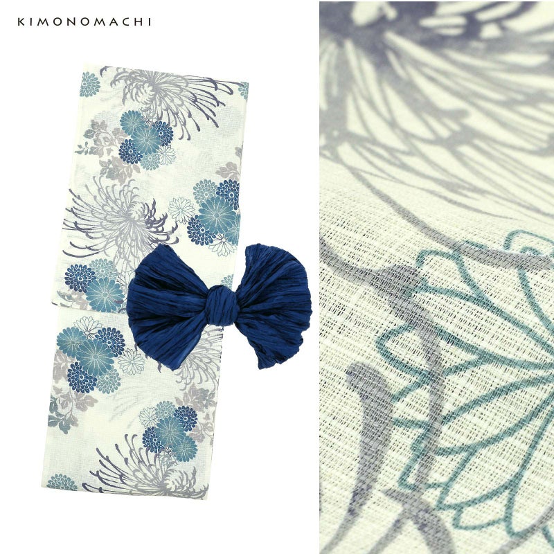 浴衣:アイボリーの地に、グレーと青紫のぼかしの入った大きな糸菊の花。紺や浅葱色、ブルーグレーの菊の花紋にグレーの葉。糸菊の繊細な華やかさとシックな配色が大人っぽい雰囲気です。