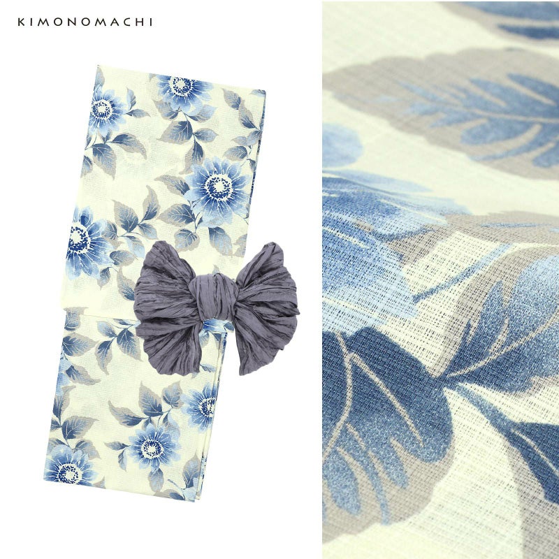 浴衣:アイボリーの地に紺色、グレイッシュな淡いブルー、ブルーグレーで表現されたヒマワリの花。夏の空のような透明感のある青と、輪郭のない水彩調のぼかした表現がさわやかなデザインです。