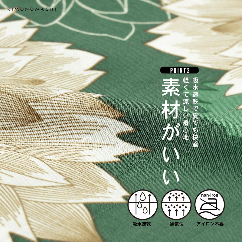 【着用シーン・季節】夏祭りや花火大会などの夏のイベントはもちろん、普段のおしゃれ着として、旅行先での散策など、様々なシーンで活躍します。着付けの手間がないので、思い立った時にさっと着てお出かけできるのが魅力です。