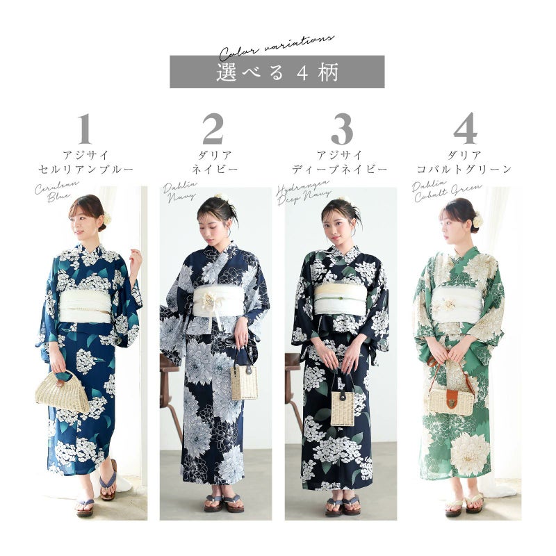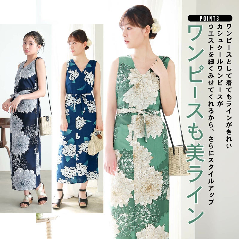 最大の魅力は、着付けが不要なカシュクールワンピース仕様であること。セットの帯を結ぶだけで、どなたでも簡単に美しい浴衣姿が完成します。
