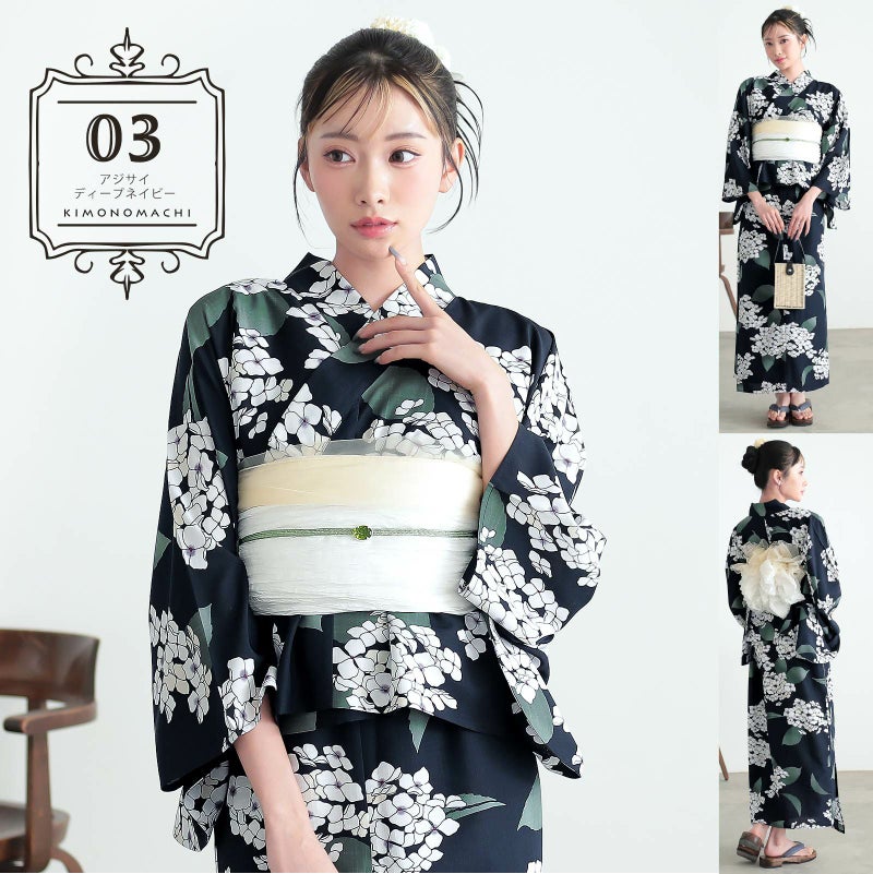 浴衣:濃紺の地にオフホワイトと淡いベージュのアジサイの花、グレイッシュな深緑のぼかしの葉。花びらの淡い紫のぼかしに蕊の深紅色が上品なアクセントとなっています。