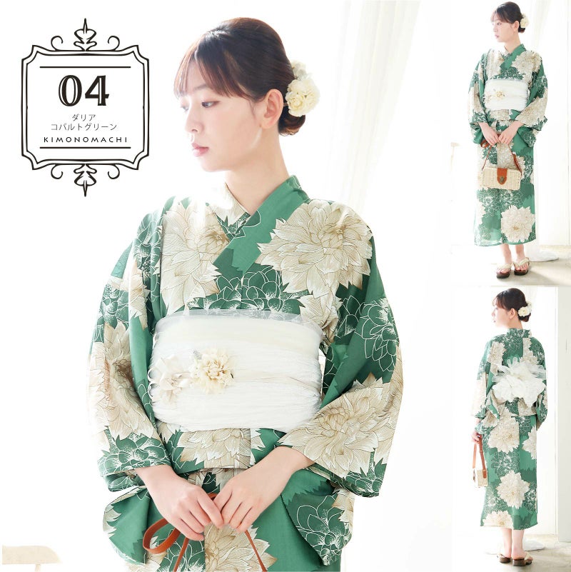 浴衣:グレイッシュなコバルトグリーンの地に、浅緑色の花のシルエット。グレイッシュな薄茶色の線に白で表現された大輪のダリアの花。オフホワイトの輪郭線で表現されたダリアが奥行きを与えています。