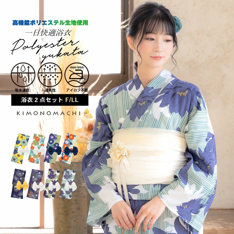 吸水速乾、高機能ポリエステル浴衣、レディース浴衣と兵児帯の2点セットです。