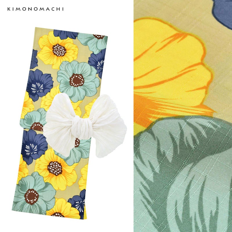 浴衣:ややグレイッシュな黄緑色の地に、明るい黄色や青磁色、浅いダークブルーのポピーを散らしたデザインです。落ち着いた色遣いと大きな花々が大人かわいい印象です。