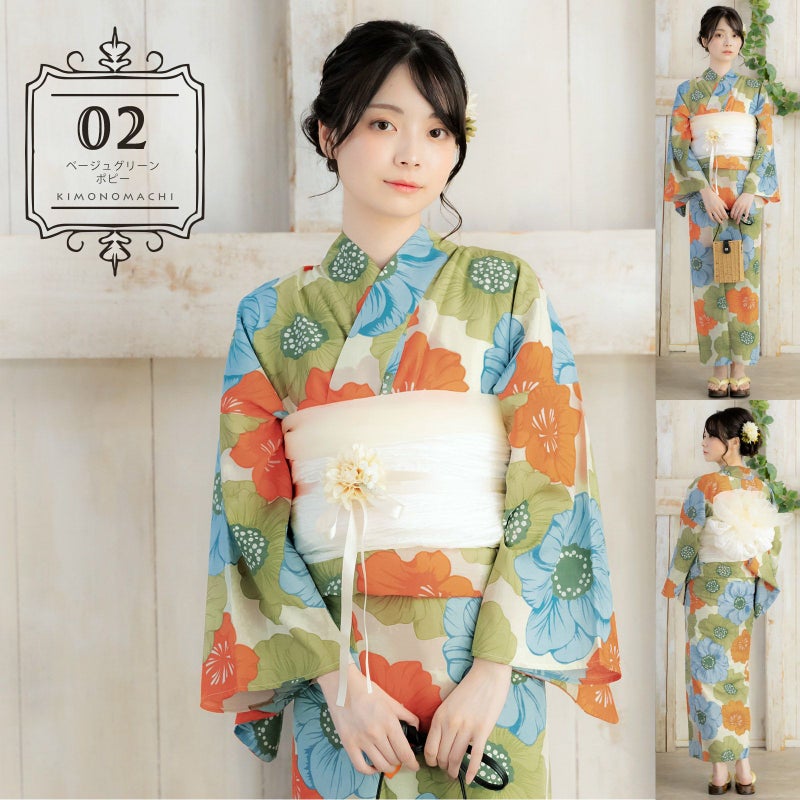浴衣:ベージュみの淡い黄緑色の地に、淡いカーキグリーンやスモークブルー、橙色のポピーを散らしたデザインです。落ち着いた色遣いと大きな花々が大人かわいい印象です。