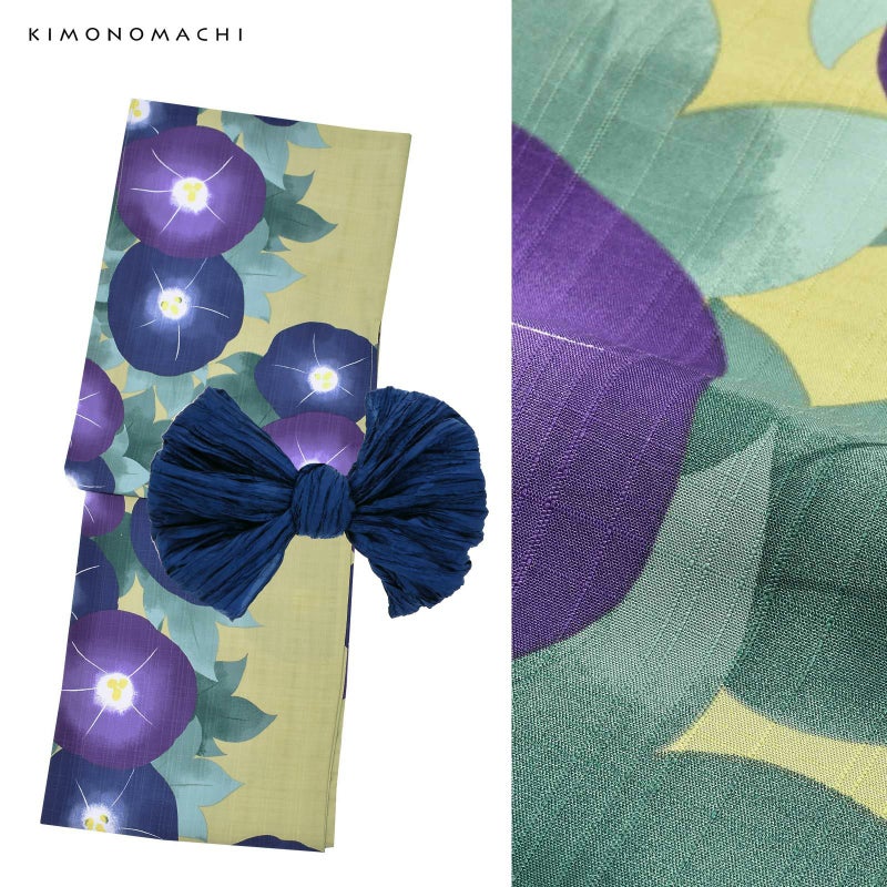 浴衣:灰みの薄黄緑色の地に、大輪の朝顔が縦の流れに配置されたデザイン。濃淡のある紺青や紫色に白い曜の入ったお花はしっとりとみずみずしく、錆びた青磁色や青鈍色の葉が奥行きを生み出しています。