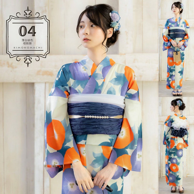 浴衣:淡い浅黄緑色の地に、大輪の朝顔が縦の流れに配置されたデザイン。濃淡のある橙色や江戸紫色に白い曜の入ったお花はくっきりとしながらも深みがあり、浅縹色や浅葱色の葉が奥行きを生み出しています。