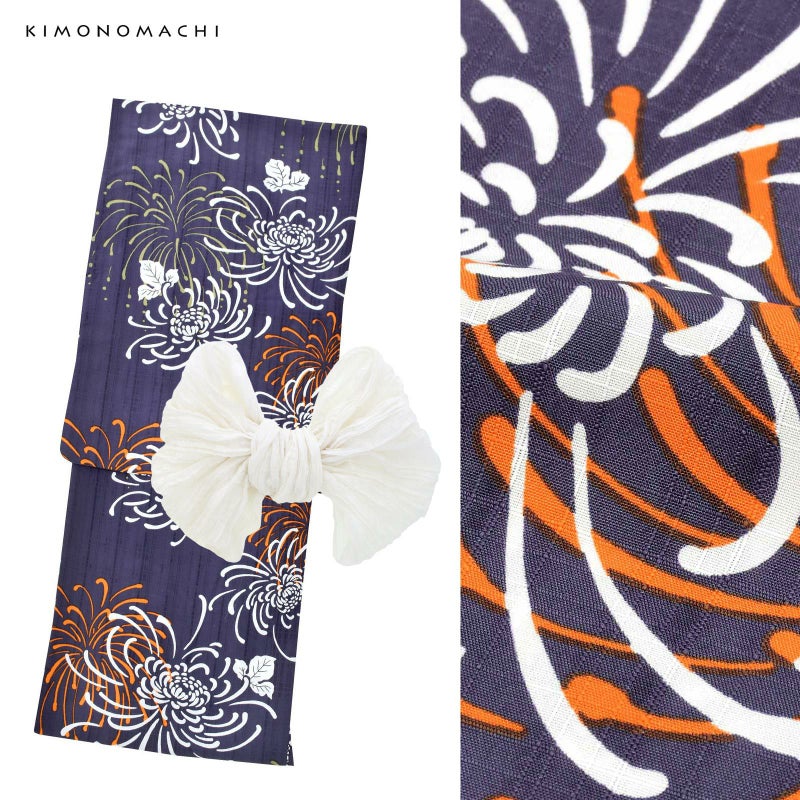 浴衣:青紫みの紺色の地。白抜きの管物の菊の合間に、冠菊の花火が開いています。花火の黄色や淡い青灰色が変化を与えています。