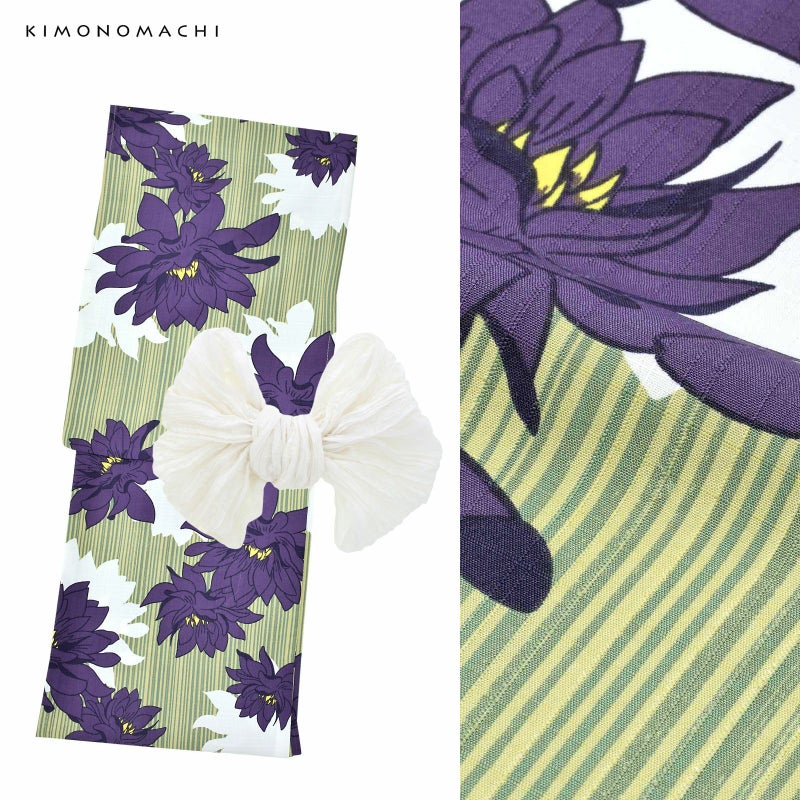 浴衣:ややグレイッシュな薄黄緑にモスグリーンの乱調のストライプの地、大きなダリアの花を散らしたデザイン。くっきりとした深紫のお花に、黄色の蕊がポイントです。白抜きのシルエットが奥行きのある印象に。