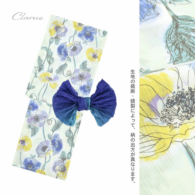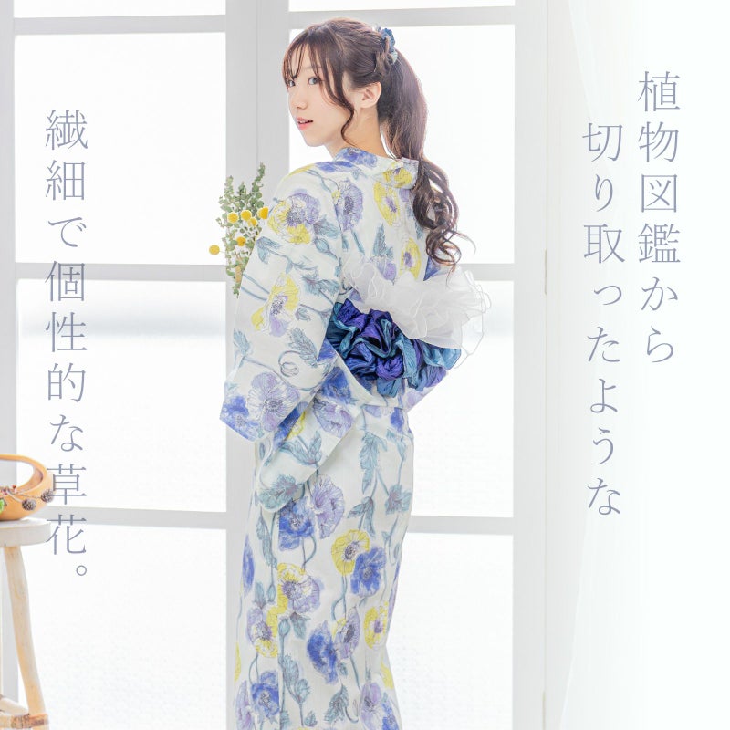 浴衣:ごく淡い白緑色の地。ペン画調の細い線で描かれた雛罌粟の花が縦向きに配置されています。あざやかな青や青紫、淡いパープルに明るい黄色の花、淡いアンティークグリーンの葉。