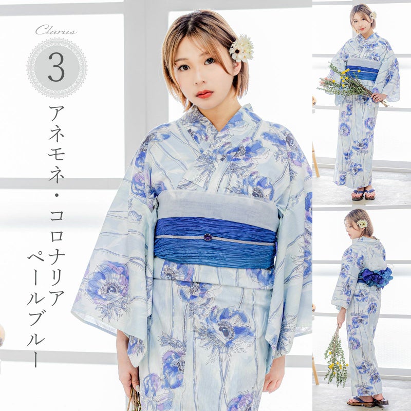浴衣:ごく淡い白緑色と水色が入り混じった地に青や青紫、パープルの配色。ペン画調の細い線で描かれた大ぶりのアネモネが縦向きに配置されています。