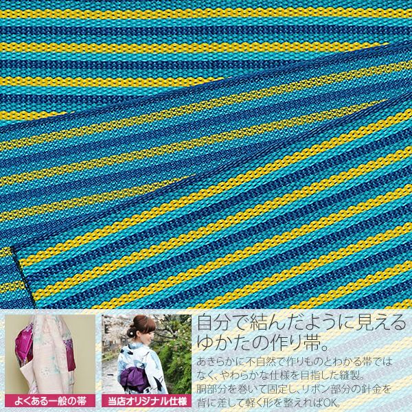 他の画像を見る 作り帯 京都きもの町オリジナル 浴衣帯 【Prices down】角出し風タイプ 結び帯単品「青緑×イエロー縞」京都きもの町オリジナル 浴衣帯 作り帯 付け帯 【メール便不可】ss2512oyk10 きもの町価格 ¥ 6,215 税込 カートに入れる お気に入りに登録する