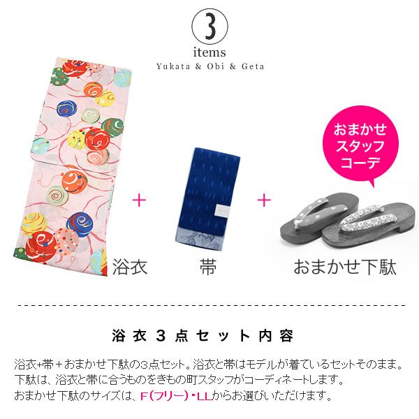 京都きもの町オリジナル浴衣単品 花火大会、夏デートに 京都きもの町オリジナル浴衣セット「ピンクにカラフル水風船」S、フリー、TL、LL 綿浴衣 お仕立て上がり浴衣 レディース 女性浴衣3点セット 【メール便不可】ss2206ykl10