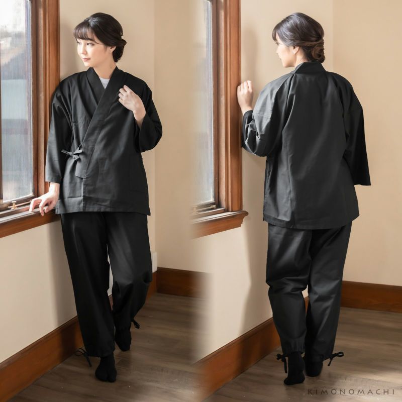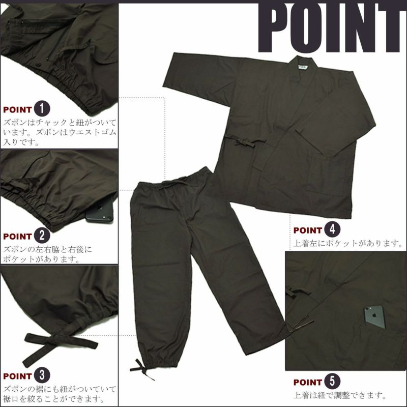 綿ポリ素材の作務衣です。上着、ズボンの上下に分かれています。