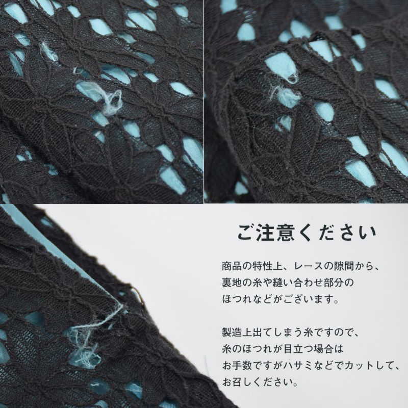 商品の特性上、レースの隙間から裏地の糸や縫い合わせ部分のほつれなどが出てくる場合がございます。