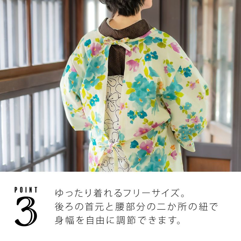 後は首元と腰部分の2箇所に結び紐がついていますので、帯のふくらみにあわせて自由に調節していただけます。