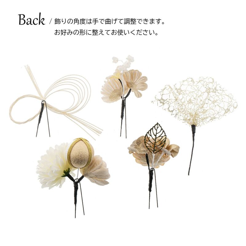 B.白:淡いクリーム色の大マム、ゴールドのお花、ゴールド×白の玉飾りを組み合わせたUピン1点。淡いベージュの小マム、ゴールドのつまみのお花、白×ゴールドのお花、ゴールドのメタルリーフのUピン1点。淡い生成色の小マム、ゴールドのお花、白の小花のUピン1点。ラメ感のある白の八の字水引飾りのUピン1点。ゴールドのチュールレースのUピン1点。