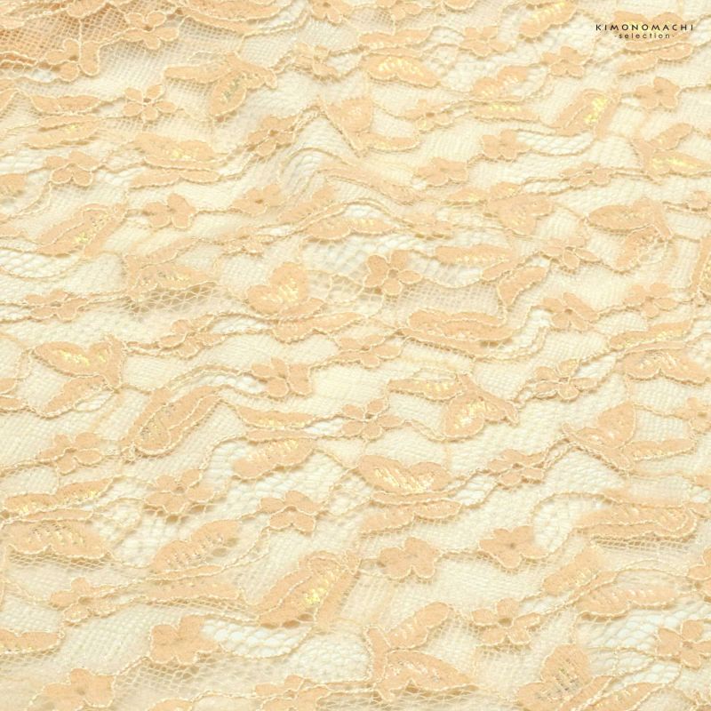 【色柄】ところどころにラメ感のある明るいベージュのチュール地に、小花や蝶が表現されたレース。裏地はオフホワイト。