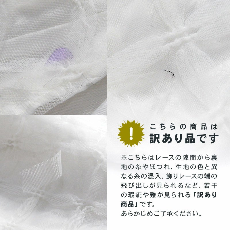 こちらはレースの隙間から裏地の糸のほつれ、生地の色と異なる糸の混入、飾りレースの端の飛び出しが見られるなど、若干の瑕疵や難が見られる「訳あり」商品です。