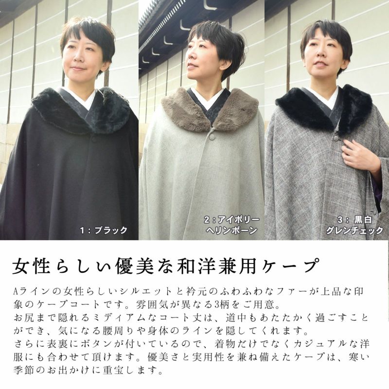 Aラインの女性らしいシルエットと衿元のふわふわなファーが上品な印象のケープコートです。雰囲気が異なる3柄をご用意。