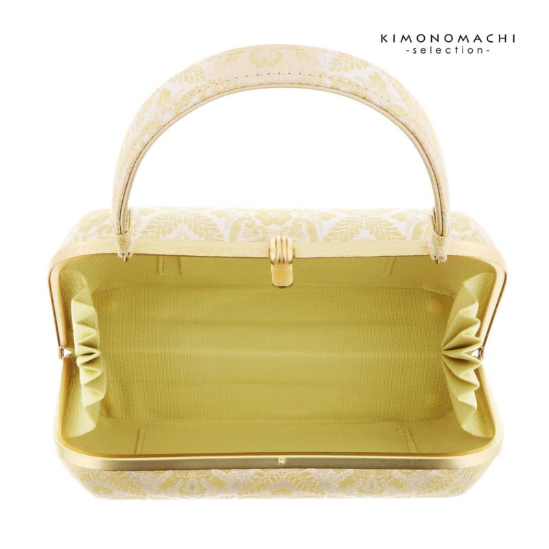 【色柄】バッグの表と裏、持ち手は、シルバーとゴールドで織り出された羊歯菱と唐花文様。口金はゴールド。草履の鼻緒はバッグと共生地。前坪、草履の台はゴールド。