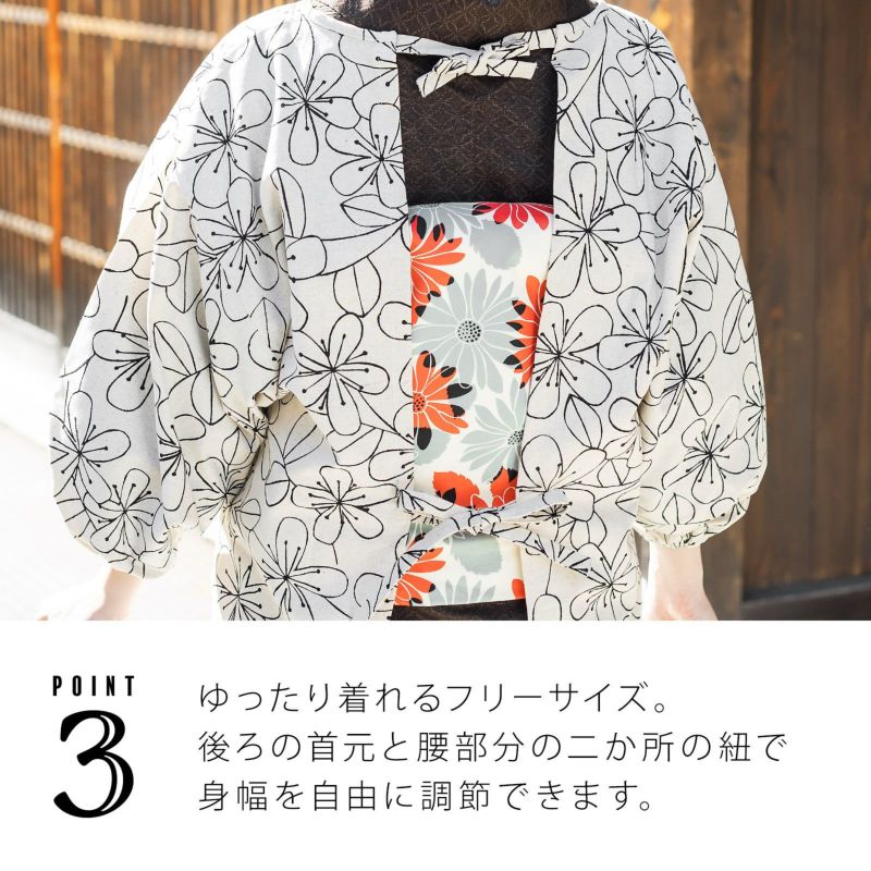 後ろの首元と腰部分の二か所の紐で身幅を自由に調節できます。