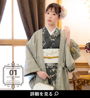 京都きもの町オリジナルブランド「KIMONOMACHI」の袷着物と京袋帯と羽織に、帯揚げと帯締め、羽織紐がセットになった、カジュアルな小紋の袷着物セットです。春・秋・冬にお召しいただけます。