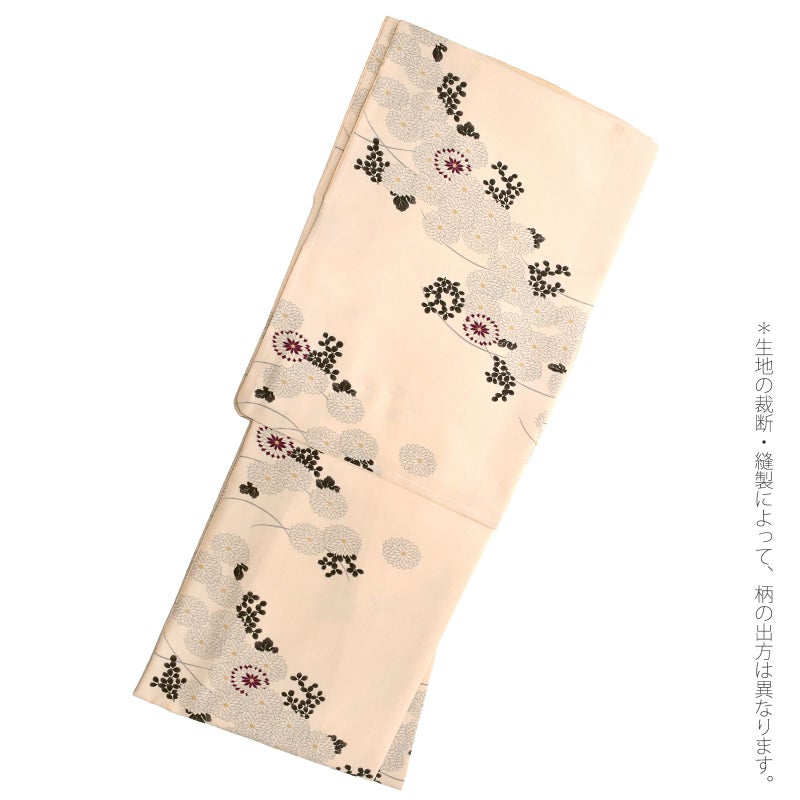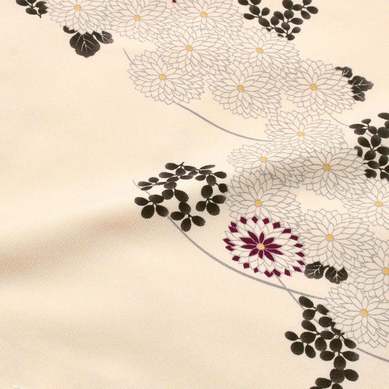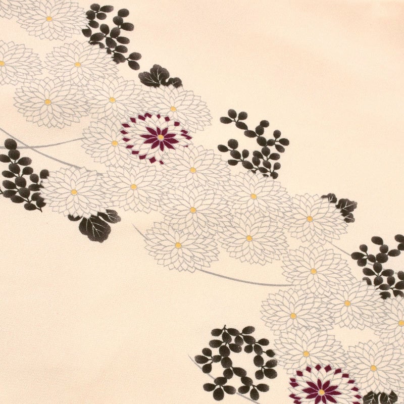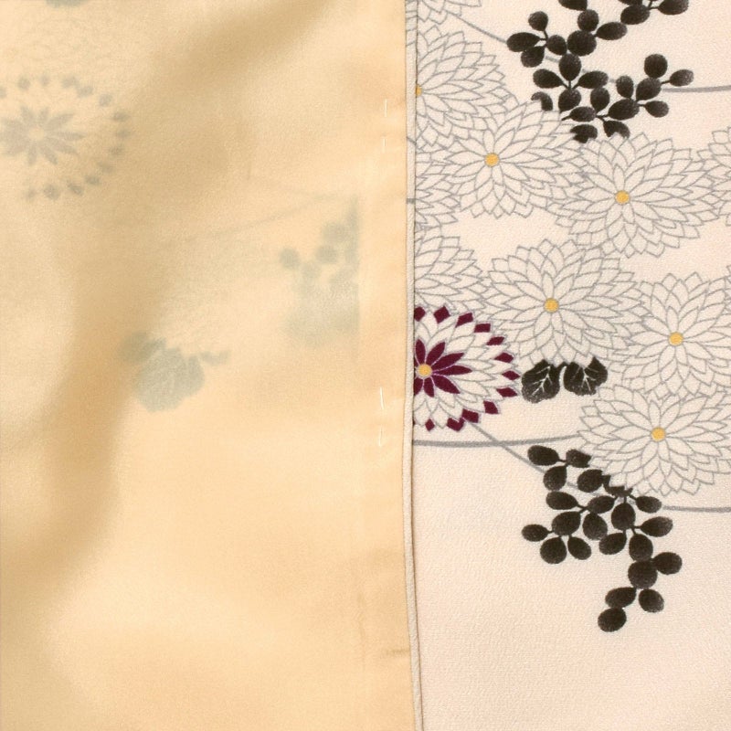 明るいベージュ色の地。同色のベージュの菊の花、薄墨色の萩の葉や芝草の模様を、斜めに流れるように配したデザイン。ところどころに使われた深紫色がポイントです。八掛はややピンク色みのベージュ色。