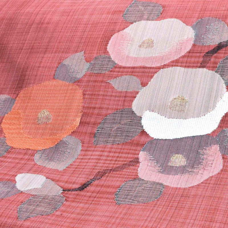 深い赤と浅い緋色の濃淡の格子の帯地。格子の色が入り混じって、全体的には淡い赤色に見えます。朱色、白、淡いピンクのぽってりと丸みのある椿の花。中心の控えめな金がポイントです。グレーの濃淡のある葉。変化のある織の表現が、可愛らしさと趣深さを演出しています。