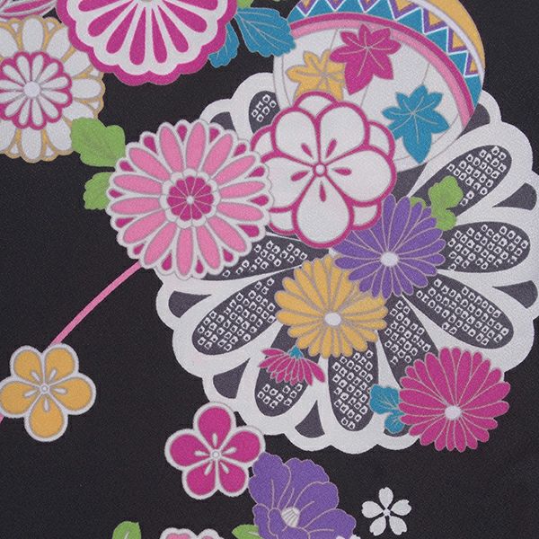 シックな黒地に四季の花々で彩られた手鞠を描いた、華やかなお着物です。クラシカルな伝統柄を、明るい色合いでポップな印象に仕上げました。