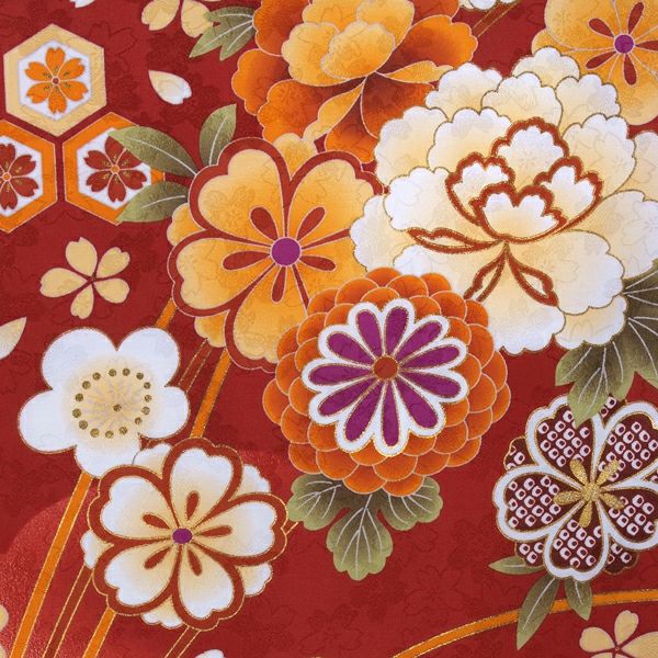 深みのある赤地にオレンジの雲取を加え、優雅な雪輪と四季の花々をあしらいました。晴れの日にふさわしい、明るく華やかなお着物です。