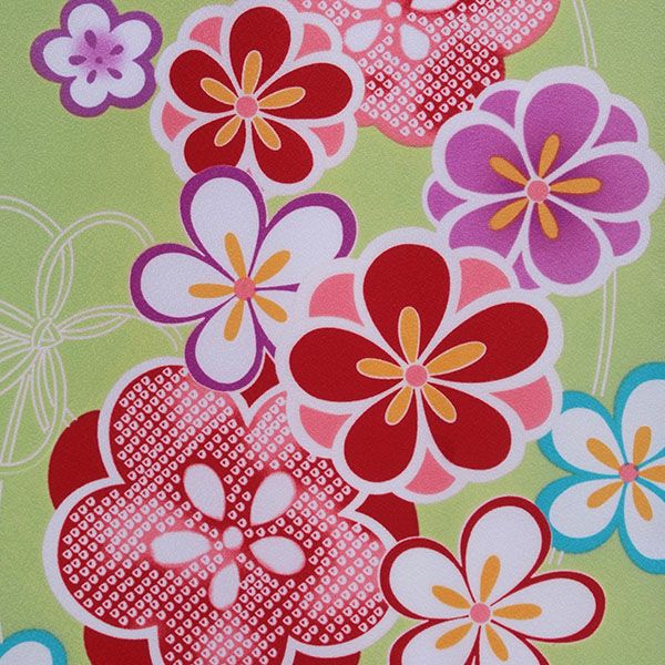 上品な若緑地に明るい色合いの梅の花をちらした、レトロモダンなお着物です。さりげなく添えられた花結びや疋田紋が、和の愛らしさを感じさせるデザインです。