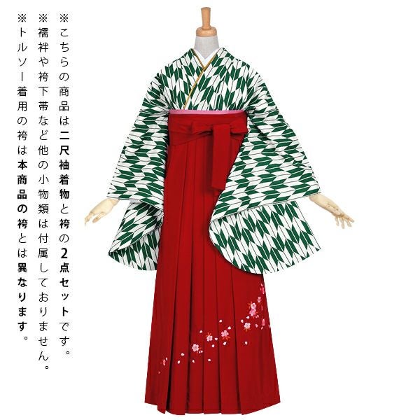 袴と相性抜群の、矢絣模様のお着物です。落ち着きのある和の緑が、レトロ感をいっそう高めています。